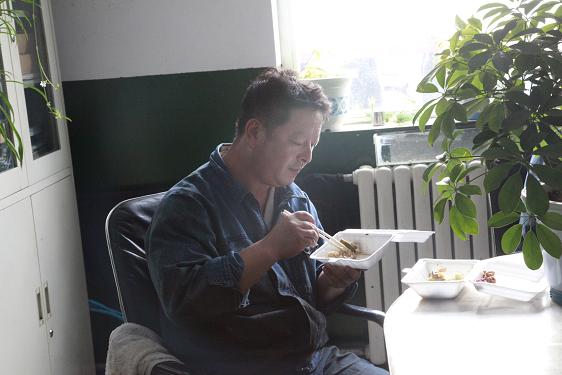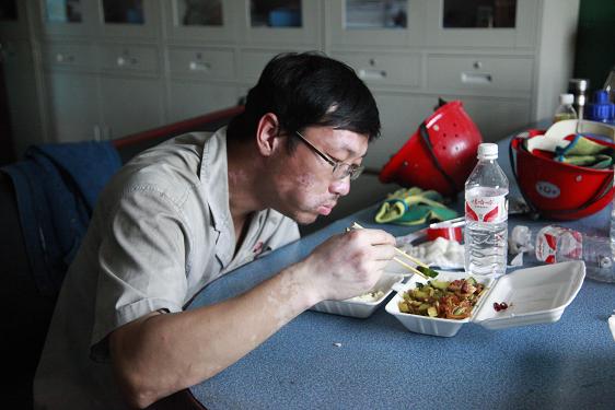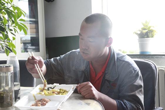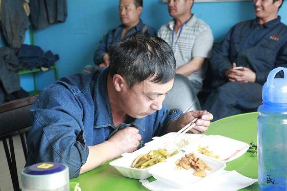 西紅柿炒雞蛋、燒茄子、土豆塊……不定時(shí)地還有魚、雞腿、紅燒肉等等。飯菜雖簡(jiǎn)單,但對(duì)于忙碌了一個(gè)早上的他們來說,卻非常美味,吃起來一副狼吞虎咽的樣子。此刻,也許山珍海味,也許滿漢全席,都略顯的失色。